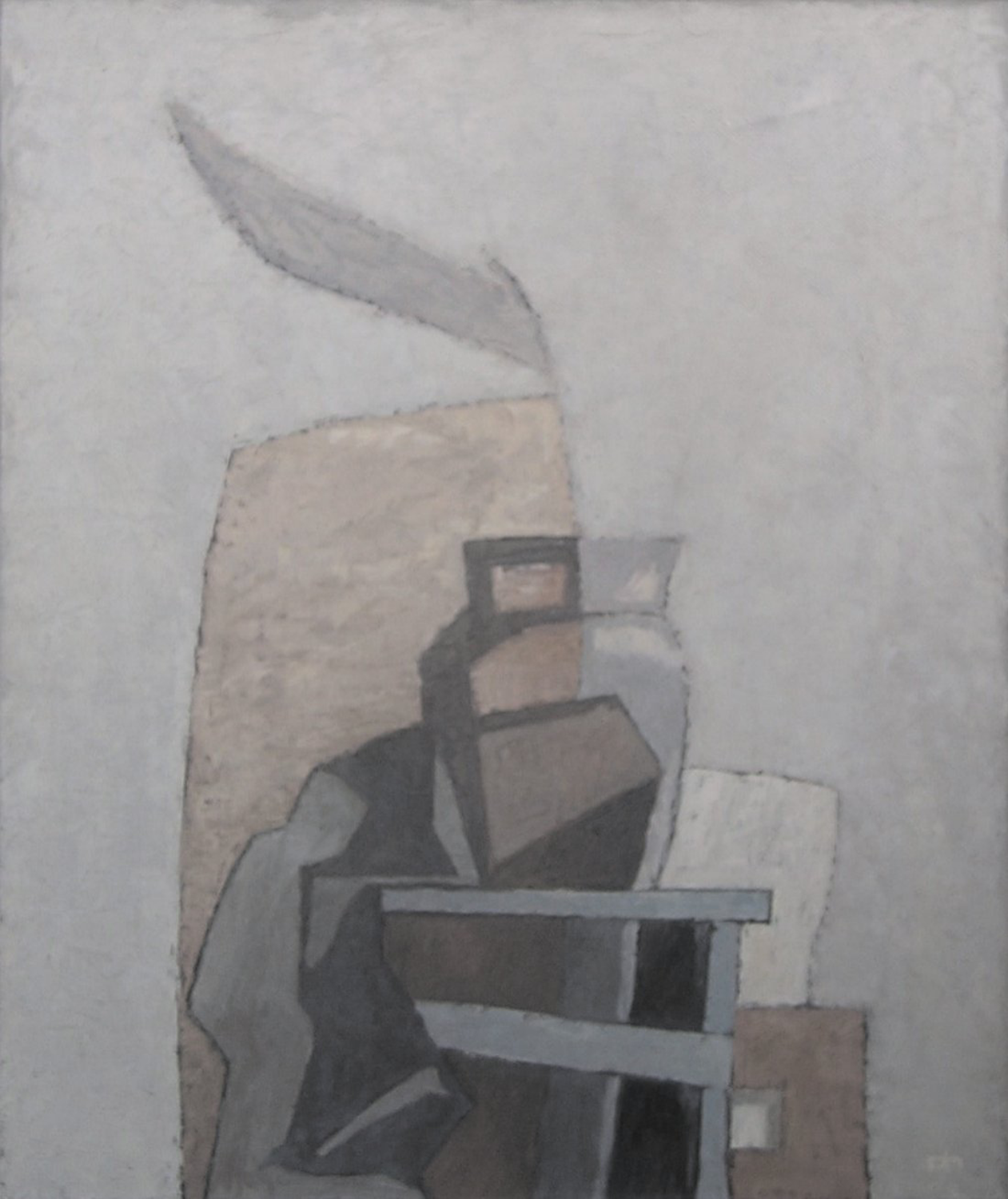 A delicate balance of form and emotion, Poëtica distills its subject into abstract, interlocking shapes. Soft grays, muted browns, and gentle beiges create a calm, contemplative atmosphere. A sweeping, feather-like form emerges from the composition, suggesting movement or a fleeting thought—like a wisp of inspiration captured on canvas.